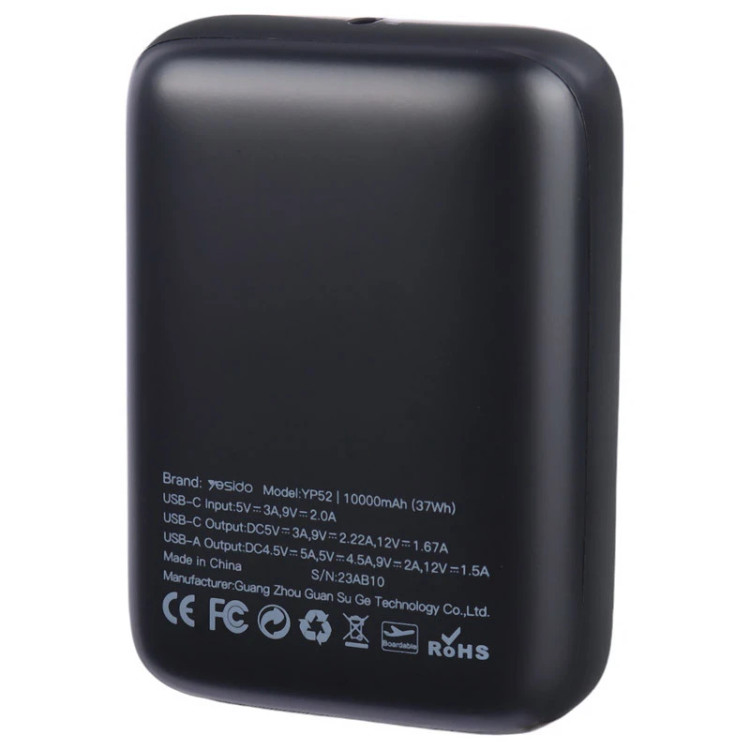 شارژر همراه فست شارژ یسیدو سری سوپر مینی مدل YP52 با ظرفیت 10000 میلی آمپر ساعت محصولی از کارخانه یسیدو است. حداکثر جریان خروجی 5 آمپر در 4.5 ولت، پشتیبانی از فناوری های PD و QC3.0 با حداکثر توان خروجی برابر با 22.5 وات است.مجهز به کلید فیزیکی جهت خاموش/ روشن کردن پاور بانک و نشانگر LED، امکان شارژ مجدد توسط درگاه Type-C و کابل همراه است.مجهز به 2 درگاه خروجی شامل یک عدد USB و یک عدد Type-C (مشترک)، تامین انرژی از طریق باتری داخلی با ظرفیت 10000 میلی آمپر ساعت است. بدنه ساخته شده از پلاستیک ABS است.